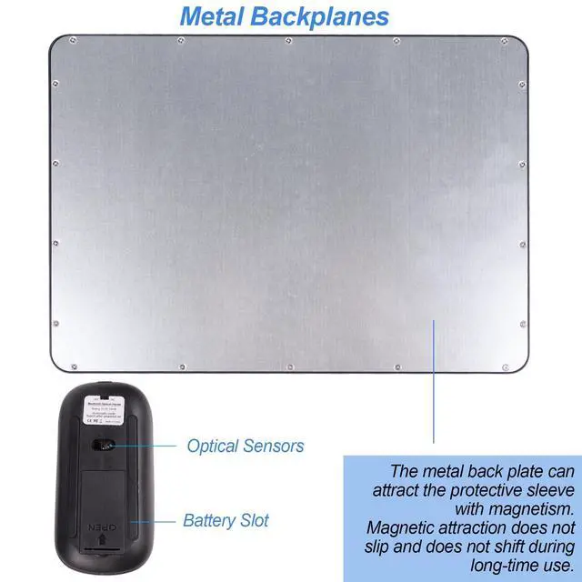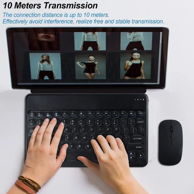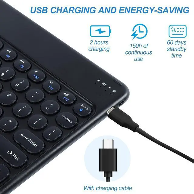 The tablet keyboard also offers media hotkeys for volume control, play and pause, and more functionality. The pack has an aluminum alloy design that can be magnetically attached to the protective case (not included) and not easily move to affect the typing efficiency. ^^ LONG-TERM USEThe portable keyboard is rechargeable, requiring only 2 hours of charging time. Once fully charged, it provides an impressive battery life of up to 150 hours of continuous use. The keyboard boasts a standby time of 60 days. To conserve power, both the keyboard and mouse will automatically enter sleep mode if they haven't been used for over 10 minutes.