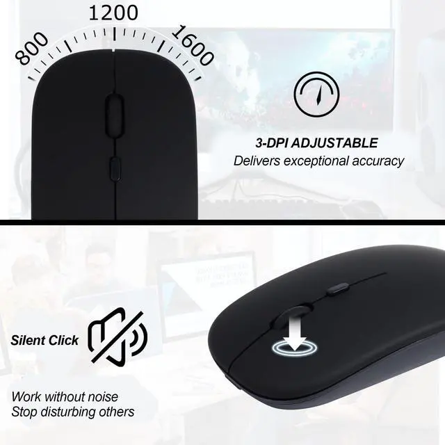 These keys are designed to reduce noise and quiet typing sessions. The wireless mouse is equipped with adjustable DPI settings (800-1000-1200) for quick and precise. What's more, the mouse operates silently, without producing any annoying click sounds.