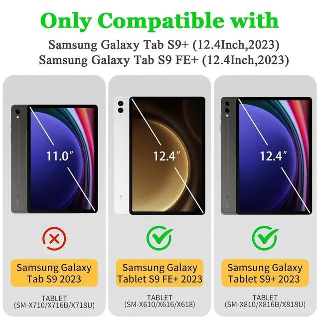 CompatibilityOnly designed for 12.4 -inch Samsung Galaxy Tab S9 Plus / Samsung Galaxy Tab S9 FE Plus 2023 released (SM-X810 / X816B / X818U / X610 / X616). NOT compatible with any other model devices. Please kindly check the model number SM-T *** on the tablet Setting before purchase! More Power Saving and DurableThis case has automatic wake-up and sleep. Adjustable AnglesTwo Stand Slots Ensure Steady and SturdyShockproof ProtectionThe outer PU leather shell protects your Samsung Tab S9 Plus tablet from shocks, drops, and impacts.