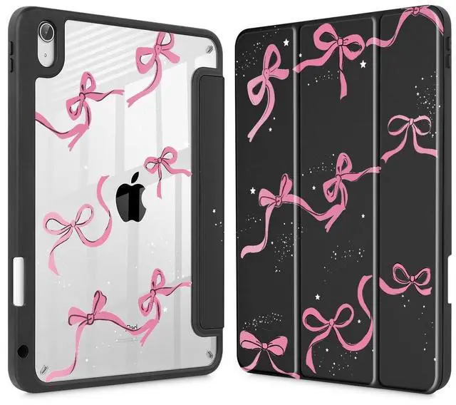 May Chen Case for iPad Air 13 Inch (M3) 2025, (M2) 2024 - [Built-in Pencil Holder] Shockproof Cover with Clear Transparent Back Shell, Auto Sleep/Wake Cover, Black Bows