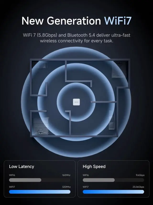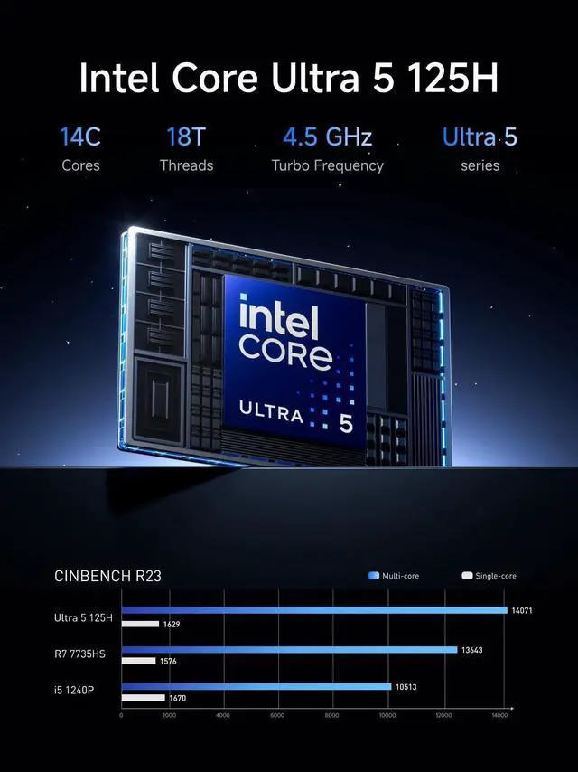 Powerful PerformanceThe AI M1 Pro Mini PC is equipped with the powerful Intel Core 5 Processor 125H(14 Cores, 18 Threads/ up to 4.5GH z), featuring the built-in Intel Arc Graphics(Graphics Frequency up to 2.2GH z) to enhance the user experience with graphics acceleration and ray tracing hardware. Boasting a remarable 2x iGPU performance compared to the previous generation. It is designed for next-generation efficient high-performance gaming and widely used in games, 3D rendering, video editing and teleworking. ^^ 2.5G Lan Port and Wi-Fi 7 SupportIt comes with 2.5G Lan Port for wired connection and and Wi-Fi 7 / BT 5.4 for wireless connection, which increased the network speed greatly and expand its functions and improved performance of computer to a large extent and allows you to use more networks such as software routers (OpenWRT / DD-WRT / Tomato etc.