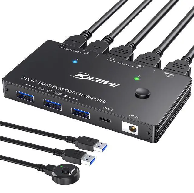 KVM Switch HDMI 2.1 8K HDMI 2.1 KVM Switch allows 2 computers/laptops to share 1 monitor and 1 set of wired or wireless keyboard mouse and other USB devices. Save time and space. ^^ Ultra HD 8K@60Hz/4K@120HzThis 8K KVM switch 2 in 1 out supports the resolution up to 7680*4320@60Hz(8K@60Hz), and can also be backward compatible with 3840*2160@120Hz(4K@120Hz), etc., supports Full 48Gpbs HDCP 2.3 HDMI 2.1 and backward compatible with HDMI 2.0 and HDMI 1.4, making the displayed image more delicate and realistic, bring you ultra-high-definition visual senses. The final resolution and refresh rate depends on the computer monitor and HDMI cable used.