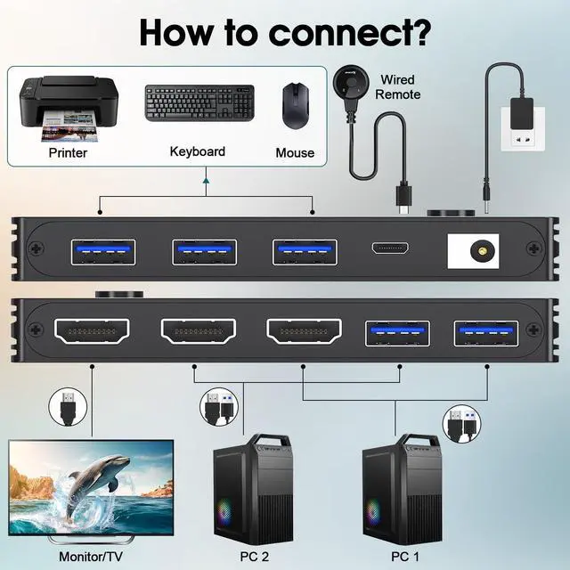 Note: This 2 computers 1 monitor KVM switch does not support hotkey switching. ^^ 8K HDMI KVM Switch with Great Compatibility HDMI 2.1 KVM Switch driver-free, plug and play. Powered by USB 3.0 cables, no external power required. This HDMI 2.1 USB 3.0 Switch can adaptive to EDID, which makes image transmission more stable and more smoothly.