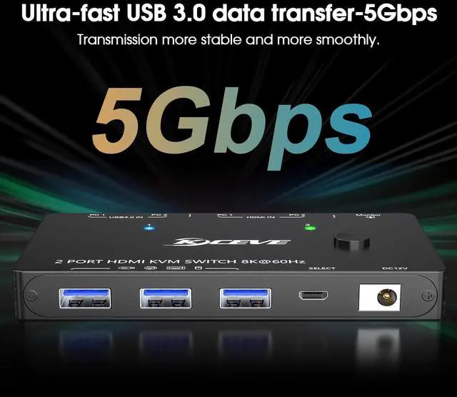 ^^ HDMI 2.1 KVM Switch with 4 USB 3.0 PortsUSB 3.0 KVM Switch come with 4 USB 3.0 ports for sharing USB devices, such as keybaord, mouse, scanners, printers, U disks and more other USB devices, supports ultra-fast USB 3.0 data transfer up to 5Gbps, 10 times faster than USB 2.0, backward compatible with USB 2.0 / 1.1 devices. ^^ Two switching modes&Indicator LightWith two computers one monitor switch, you can switch between 2 computers through wired remote controller (included) or panel button, two color lights indicate the corresponding computer.