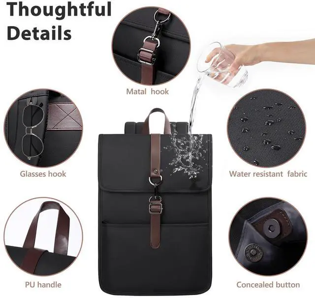 Why We Love ThisThis 15.6 inch laptop backpack is made of Oxford cloth, which is ultra-light, Water Resistant and Wear-resistant, ensuring safety and durability. The design featuring black fabric combined with brown PU buckle straps and PU handles is both vintage and fashionable. ^^ Slim & Lightweight & Original DesignDesigned by Heroic Knight, this vintage backpack combines elegant styling with functional, durable quality. It features a main compartment, a front zippered pocket, an anti-theft pocket, and two side pockets. Place your items in different pockets to keep them neatly organized and easier to find.