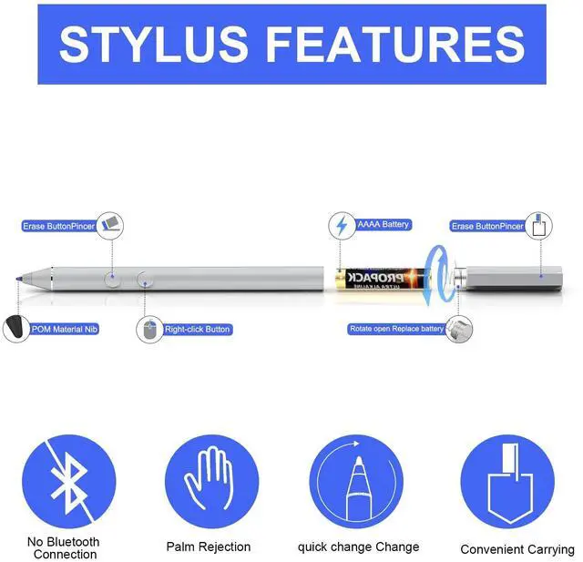 Easy to UseThis stylus pen doesn't require any special software or Bluetooth connection in order ,just press the key to use.With shortcut keys eraser and right mouse button functions.