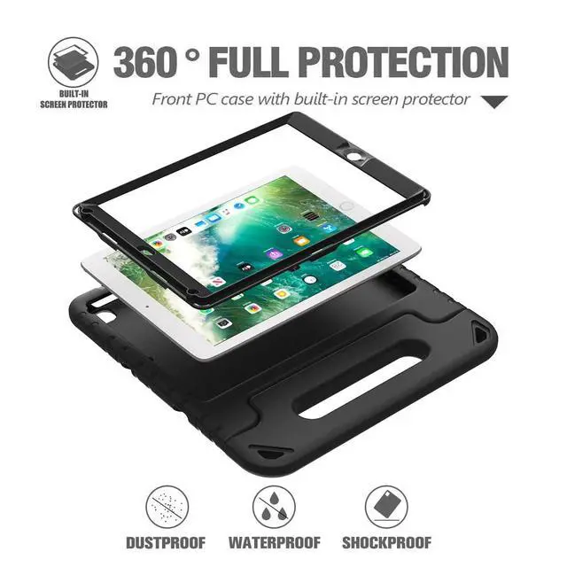 Compatible with iPad 9.7 -inch 2017 (iPad 5th generation) / New iPad 9.7 2018 Release (iPad 6th generation) / iPad Air 2/ iPad Pro 9.7, NOT for iPad Mini or other tablets. iPad 6th generation (A1822/A1823)/ iPad 5th generation (A1893/A1954) iPad Air 2 (A1566/ A1567)/ iPad Pro 9.7 (A1673/A1674/A1675) ^^ 180 degree rotatable grip handle provides extra security, and can also be folded back into a stand for a horizontal viewing or typing position. ^^ With Built-in Screen Protector. Anti-slip silicone soft outer layer case provides great handling and extra cushion for impact protection.
