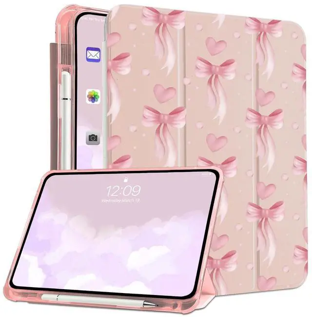 Protection: This kawaii girly bowknot case for ipad is made of two materials. The comfortable and soft silicone and high-quality durable TPU material provide a comfortable touch for the pad. The back of this pink heart bow case for ipad is made of soft TPU, which provides full body protection and is more durable than traditional silicone materials. It is less prone to yellowing, prevents scratches, and maximizes the protection of your pad from damage and scratchesAuto Wake/sleepBuilt-in magnetic strip, our pink heart bow case for ipad can automatically wakes or puts your tablet to sleep when the lid is opened and closed, protecting and extending battery life; precise cutout also completely supports newest touch ID key function. Built in pen holder ensures the safety of your pencil. Adjustable angleThe trifold stand shell design of this kawaii girly bowknot case forapple ipad can easily change the angle to meet your viewing and typing needs. This girly lovely aesthstic case for ipad can be folded into a stable triangle, firmly supporting your pad. Whether it's work, study, or watching movies, they can meet your needsPerfect