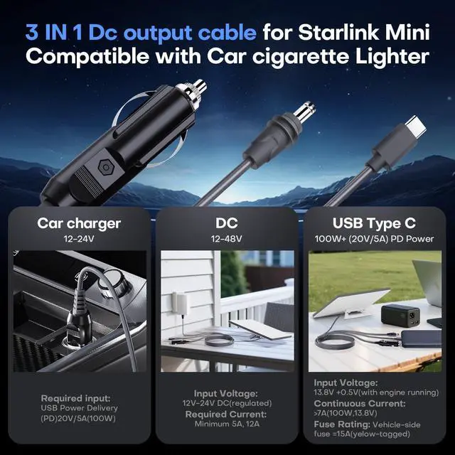 3-in-1 Power Cable for Starlink Mini Features USB-C, DC-to-DC, and cigarette lighter connectors, giving you multiple charging options whether at home, in your car, or outdoors. ^^ Two Length Options (10FT/3M & 16.4FT /5M) Choose the perfect size for your setup: the 10FT version for compact use, or the 16.4FT version for maximum flexibility and distance. ^^ Durable & Waterproof Design Made with high-quality, weather-resistant materials to withstand rain, dust, and outdoor environments, ensuring stable power wherever you go. ^^ Reliable Outdoor & Travel Companion Ideal for RV trips, camping, off-grid adventures, or emergency use, keeping your Starlink Mini powered and connected at all times. ^^ Easy to Carry & Replace Lightweight and portable, this extension cord works as a reliable replacement or backup cable, ensuring uninterrupted connectivity when you need it most.