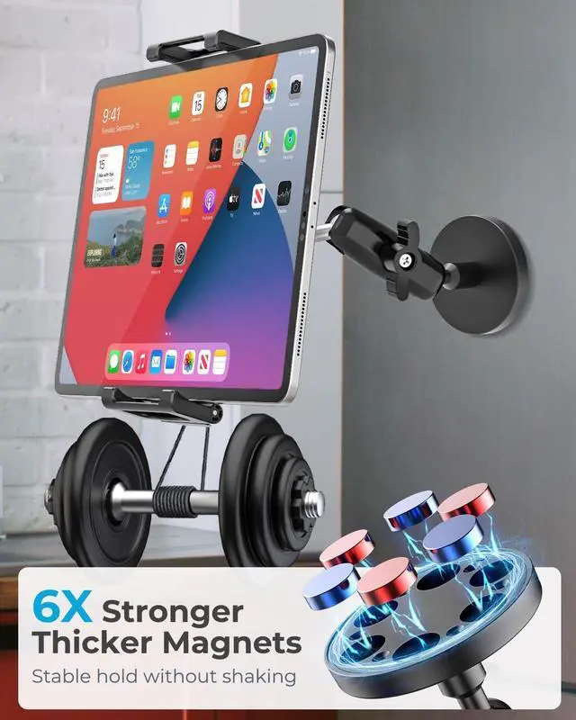 Lightweight but really durable, sturdier than cheap plastic holders. ^^ Plenty of UsesFits great on fridges, gym equipment, and any metal surface. Use the included base, and it works on desks, countertops, wall or any flat spot too. Perfect for home, office, workouts, or cooking, lots of ways to use it. ^^ Wide CompatibilityFits most tablets in the 6.1 - 15.6 inch range, covering popular models. The bracket has a memory function: it remembers the last opened width after first use, no repeated adjustments needed. It holds your tablet snug even with a thick caseno need to remove it. ^^ Compatible DevicesCompatible with iPad Pro 11''/13'', 2025/2024/2023 iPad 12.9 '', iPad mini 3/ 4/ 5/ 6, iPad Air 11'', iPad 10th/ 9th/ 8th/ 7th; Tab S10 Ultra / S10+ / S10 FE, Galaxy Tab S9/ S8/ S7/ S6/ A9/ A8/ A7/ A6; iPhone 17 16 15 14 13 Pro Max/Plus/Mini, iPhone XR; S25 S24/ S25+ S24+/ S25 S24 Ultra/ Z Fold6 5/ Z Flip6 5/ A55 A35 and all most 6.1" - 15.6" android tablets & cellphones.