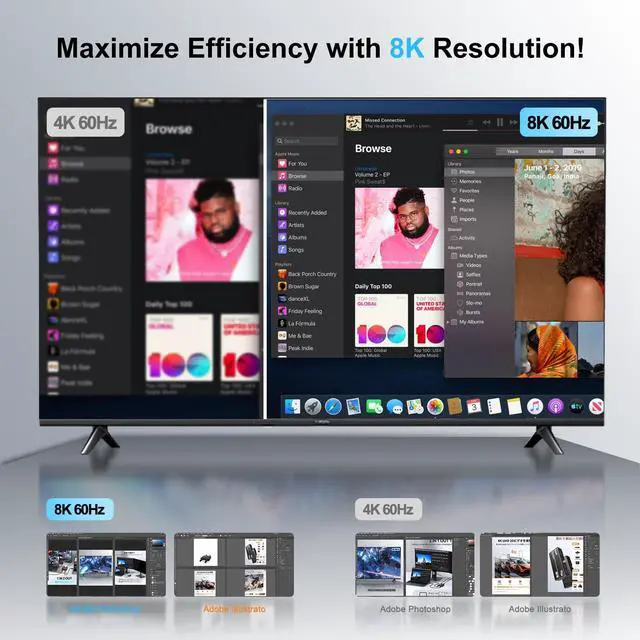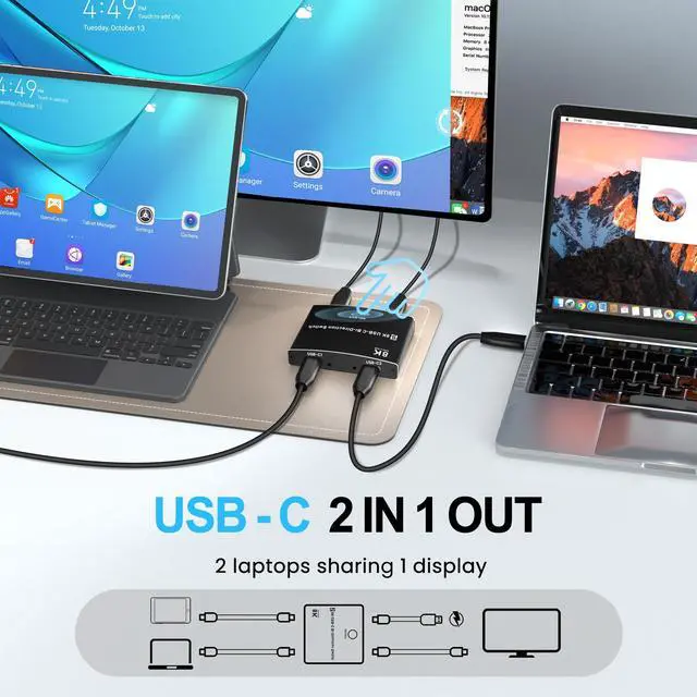 Comes with three high-speed 40Gbps USB C cables ( 3.3 ft each), saving you the hassle of finding compatible ones. For best performance, use certified cables under 10ft to support 8K@60Hz or 4K@120Hz video. ^^ [Blazing-Fast 40Gbps Bandwidth Boost Productivity] Equipped with up to 40Gbps transmission bandwidth, this USB C switch supports simultaneous transfer of 8K@60Hz video and 10Gbps dataperfect for large file transfers, high-speed backups, and real-time video editing. Say goodbye to waiting, and hello to efficient multitasking. ^^ [Crystal-Clear 8K@60Hz / Ultra-Smooth 4K@120Hz Output] Whether you're editing videos, designing in CAD, or immersed in high-frame-rate gaming, this USB C switch delivers outstanding visual clarity and performance.