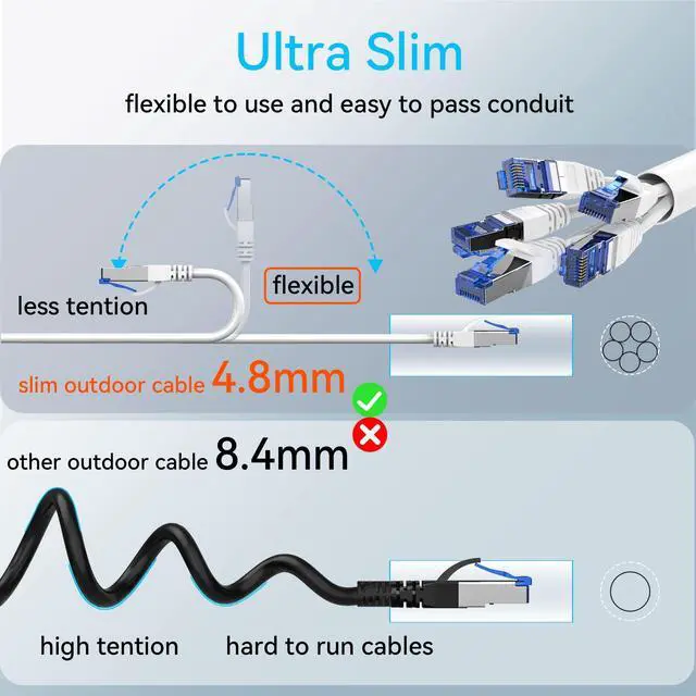 Shielded ethernet cable SSTP (Screened Shielded Twisted Pair) can prevent electromagnetic interference (EMI) and reduce crosstalk noise over the gaming ethernet cable high speed. ^^ Utral Slim - Cat 8 high speed ethernet cable stands out for its slim design. Ethernet cable 100+ ft is ideal for routing in tight spaces for underground and indoor cable conduit because its slim and smooth jacket. Compared to other thick and stiff outdoor Cat8 network cables with high tension, same size conduit can accommodate more of slim cat 8 ethernet cable and is easier to pass through because of less strain relief.