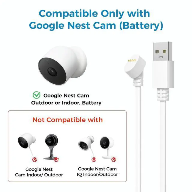 Google Nest Cam (Battery): Designed exclusively for the Google Nest Cam (Battery), this charging cable delivers a secure, custom fit and reliable power connection. Not compatible with other modelsthis cable is purpose-built for worry-free performance every time. ^^ Waterproof