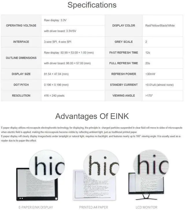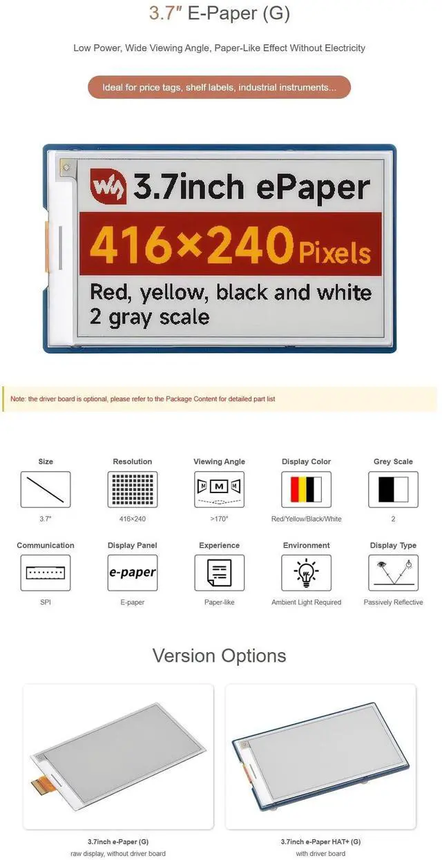 OverviewThe 3.7" e-Paper Display (G) is a versatile E-Ink display that provides a paper-like experience with vibrant colors, including Red, Yellow, Black, and White. This display is ideal for projects that requirelow power consumption and high readability, such as price tags, shelf labels, and industrial instruments. Thanks to its SPI interface, the display is compatible with a wide range of controller boards, including Rasp-berry Pi, Jetson Nano, Ar-duino, STM32, and ESP32. One of the standout features of the 3.7" E-Ink Display is its ultra-low power consumption.