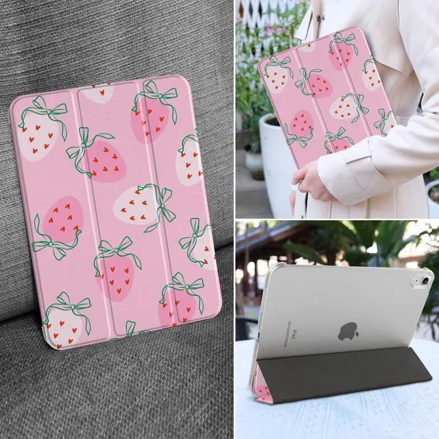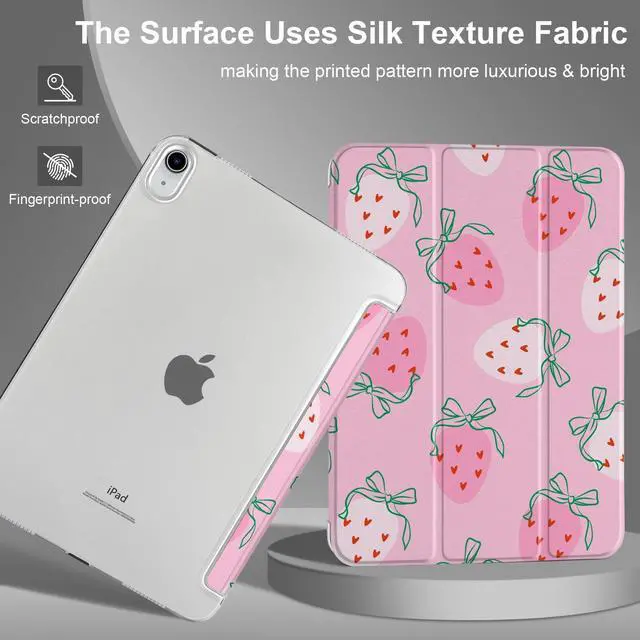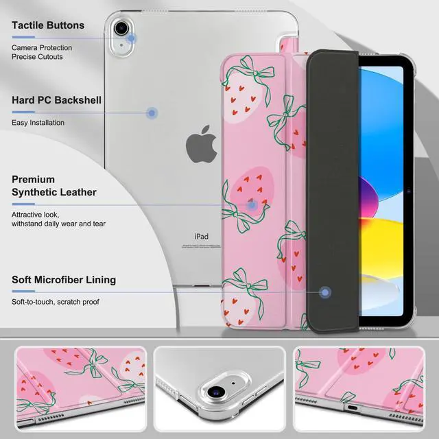 MEEgoodo for iPad A16 11th Generation Case 2025 11 inch, Tablet Cases for iPad 10th Generation 2022, Tablet Cover with Silk Texture & PC Clear Back Cover, Strawberry & Bow
