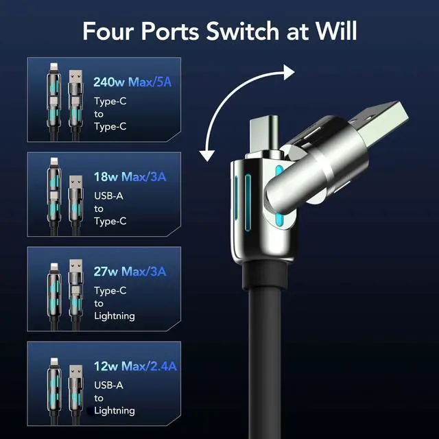 4-in-1 Universal Cable One Cable. Every Device. Eliminate cable clutter with the MFish 4-in-1 charging cable featuring USB-C to USB-C, USB-C to Lighting, USB-A to USB-C, and USB-A to Lighting connectors. Designed to power nearly all your tech essentialsiPhones, iPads, Samsung Galaxy, MacBooks, laptops, tablets, and more. ^^ Ultra-Fast 240W Power Delivery Supports the latest PD 3.1 fast charging standard with a maximum output of 240W. Quickly charges high-power devices like MacBook Pros, iPads, and even iPhone 16 up to 96% in around 35 minutesso youre always ready to go.