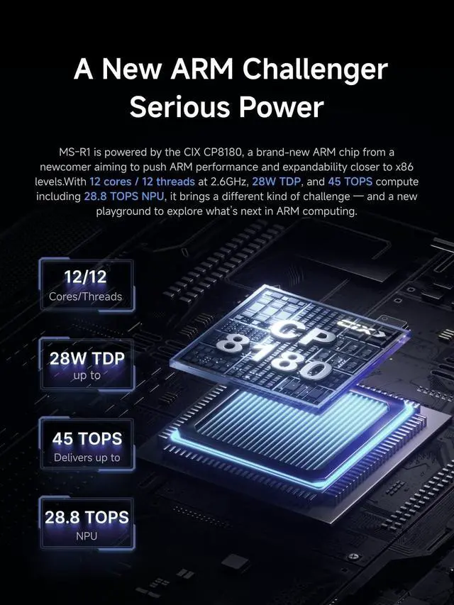 The First Mini PC to Support UEFI BootThe MINISFORUM MS-R1 is equipped with an ARM architecture CP8180 processor (12C/12T, 2.6G hz, up to 45 TOPS AI computing power) and supports UEFI Boot, enabling high-parallel virtualization in Proxmox and KVM environments. As the first ARM Mini workstation to support UEFI boot, the MS-R1 is a truly plug-and-play ARM PCsimply write the ISO to a USB drive, install, and boot directly. It is an ideal platform for classroom teaching, laboratory research. ^^ LPDDR5 ECC SuppotedMS-R1 mini pc is deeply optimized for containerized and Docker-based Android VMs, supporting up to 64GB of ECC LPDDR5 memory with a maximum frequency of 5500MHz (when ECC is enabled, the available memory capacity is reduced by about one-eighth).