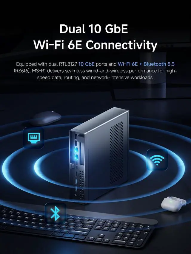 It supports PCIe 4.0 x4 M. 2 2280/22110 (up to 8TB) and comes with an adapter board for flexible expansion to U. 2 or additional NVMe solutions, allowing for unlimited storage scalability. ^^ Extended StorageThe MS-R1 mini desktop computer supports half-height PCIe form factor and a standard PCIe x16 slot (physical x16, signal x8), allowing for flexible expansion of graphics cards, network cards, or U. 2 storage. Whether for hardware experimentation or system expansion, the MS-R1 unlocks more possibilities for the ARM platform. ^^ Dual 10G Lan+Wifi6e+Bluetooth 5.3T he mini computer equipped with dual RTL8127 10 GbE ports and Wi-Fi 6E + Bluetooth 5.3 (RZ616), MS-R1 delivers seamless wired-and-wireless performance for high-speed data, routing, and network-intensive workloads.