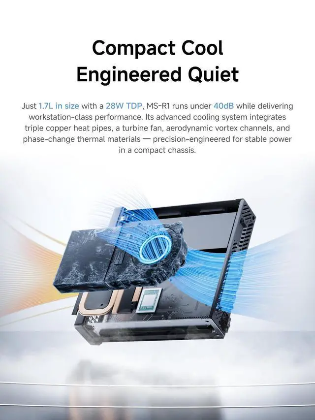 ^^ Efficient Heat DissipationJust 1.7L in size with a 28W TDP, MS-R1 Mini PC runs under 40dB while delivering workstation-class performance. Its advanced cooling system integrates triple copper heat pipes, a turbine fan, aerodynamic vortex channels, and phase-change thermal materials precision-engineered for stable power in a compact chassis. ^^ Triple Display OutputMINISFORUM MS-R1 Mini Workstation supports up to triple 4K displays via HDMI 2.0 (Up to 4K@60Hz), 2 x Type-C(Alt DP 1.4 ) (Up to 4K@120Hz) ports. Triple-screen output increases your productivity by expanding multiple workspaces. It is also an ideal choice for design creation, video editing, programming, and financial business professionals.