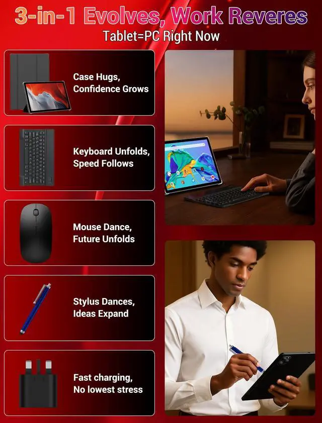 Gallery-Grade Visual Theater Immerse in cinematic splendor on this 11 inch tablet's luminous stage: 2000x1200 resolution pirouettes beneath G+G double glazing, with 178 viewing that captures every angle. Dual BOX speakers cascade richness while Widevine L1 unlocks HD realms. Capture lifes poetry with 8MP+13MP cameras, ideal for gaming tablet marathons or movies with real-time subtitles. FCC/CE certified tranquility gifts peace of mind. ^^ Android 15 Intelligence Unleashed The Android 15 tablet conducts digital symphonies: T606 octa-core CPU and Mali-G57 GPU (scoring AnTuTu 255k) glide through split-screen workflows and homework correction. 36GB RAM (LPDDR4X) + 256GB + 1TB(Not included, buy TF card separately) handle PC experience demands. 5G/ 2.4G Dual WiFi weaves seamless connectivity, while Bluetooth 5.0 syncs peripherals instantly. Premium tablets for everyone redefine productivity. ^^ Sculpted Elegance, Boundless FreedomA 0.32" metal sonnet weighing 1.13LB, cradling an 80, 000mAh battery with power-saving tech for week-long adventures. The 3-in-1 keyboard/mouse/stylus trio transforms your tablet with keyboard into a mobile studio. Type-C fast charging revives in moments, while FM radio whispers and emergency SOS deliver security. GMS Certified harmony elevates electronics tablets. ^^ Sanctuary of Intuitive Innovation Android 15s accessible design welcomes all: 200% font scaling soothes weary eyes, blue light sanctuary guards rest, and voice reading narrates worlds. Focus Mode with time/content management cultivates clarity, while data security + app lock shield your universe. Stylus dances across 2K projection stages, and OTG bridges forge data highways. Every tablet with pen moment becomes luminous. ^^ Curated Luxury Unboxing Experience Discover a gift-ready ecosystem: Tablet with keyboard, Mouse, Stylus, Case, Screen Protector, Card Pin, Fast Charger, OTG Cable etc. The 16:10 golden ratio frames visions in 84.9 % screen poetry, while durable metal with straight bezel armors elegance. Global Positioning navigates journeys, FCC/CE seals promise safety. Every accessory, a thoughtful stanza for lifes explorersthe ultimate computer tablets companion.