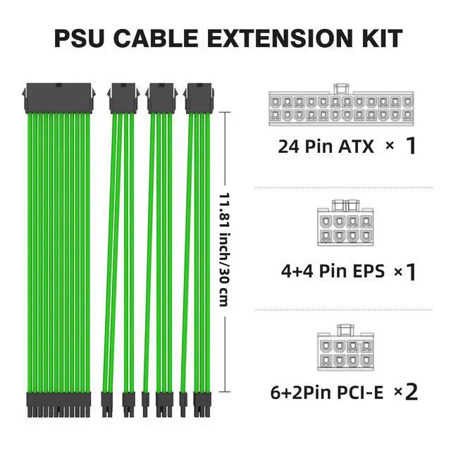 The kit includes: 1x24 PIN ATX Extension Cable (For Motherboard), 1x4+4 PIN EPS Cable (For CPU), 2x 8to 6+2 PIN PCI-E Cable (For GPU) ^^ 16AWG CABLESOur PSU extension cable uses 16AWG copper wire, which significantly increases the copper content, reduces resistance and power consumption, and solves the problem of power line heating caused by the use of high-power products ^^ CABLE COMBSThe set of white connector housing provides 4 pure white cable combs for each cable. The set of black connector housing provides 8 cable combs (4 clear+4 black) for each cable ^^ MULTIPLE COLORSSMEOZZ offers a variety of colors for you to choose from, allowing you to freely DIY your computer case and make it stand out from the crowd ^^ SALES SERVICEIf you have any questions or problems in your shopping, please contact us. Our team will provide you with the good service.
