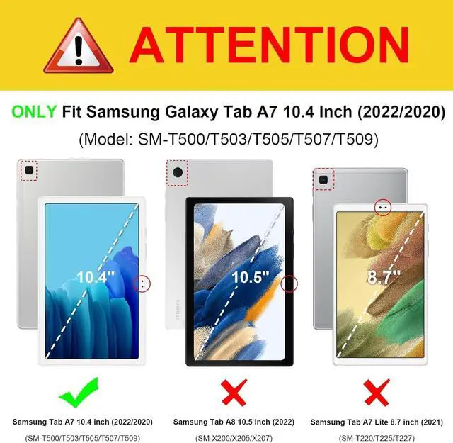 Compatibility model: ONLY Compatible with Samsung Galaxy Tab A7 10.4 inch 2022 Release (SM-T503/T509); ONLY Compatible with Samsung Galaxy Tab A7 10.4 inch 2020 Release (SM-T500/T505/T507); not fit other tablets.