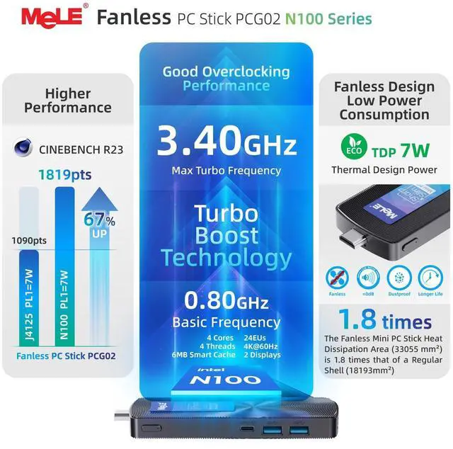 Latest Celeron N100 Processor - This MeLE N100 PC Stick upgraded with Celeron N100 ( 0.8GH z to 3.4GH z) Quad-Core Processor, provides 45% more performance release compared to the previous J4125. This small computer on a stick is small enough to carry everywhere, enjoy your computing while traveling, in classrooms, conference rooms, industrial IoT applications. It pre-installed the Windows 11 Pro system, also support Linux, Ubuntu, you can choose what you need. ^^ Memory and Storage - This PCG02 compute stick equipped with 8GB LPDDR4, 256GB storage, a Micro SD card slot can be added separately to expand the storage up to 1TB, with two USB-A 10Gbps ports and one USB-C 10Gbps ports, easily connecting to other devices, allow you to deal with multiple tasks and projects easily at the same time.