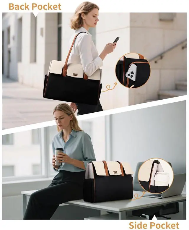 ^^ High-Quality & Studry: The laptop tote bag is meticulously crafted from water-resistent polyester fabric with PU leather. The use of reliable zippers, upgraded and reinforced stitching significantly bolsters the overall sturdiness of this practical work bag. The thick foam padding integrated inside provides reliable protection for your laptop against potential bumps, while the reinforced handles support heavy loads without strain.