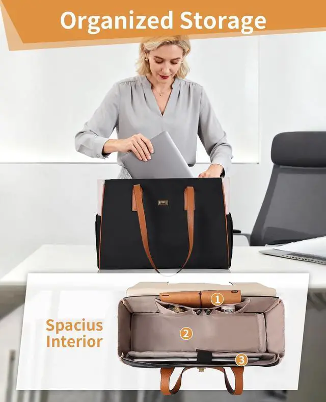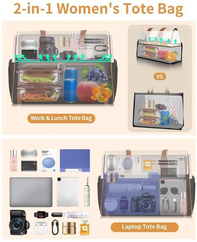 Laptop Bag: This work tote bag with its size of 16.9" x 7.3" x 12.6" (L*W*H), presents ample space complemented by multiple compartments. The upper area of the cooler compartment can hold your laptop, charger, notebook, etc. Specifically designed for the busy professional ladies, the laptop briefcase keeps everything organized and easily accessible. ^^ 2-in-1 Tote Bag for Lunch and