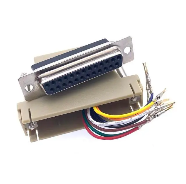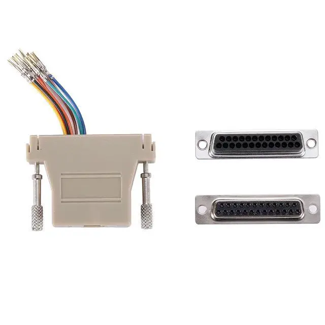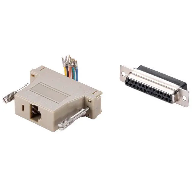A DB25 female to RJ45 adapter is a connector that allows you to convert a DB25 serial port to an RJ45 Ethernet port (commonly used for networking). This adapter enables you to connect devices with DB9 serial interfaces to a network using an Ethernet cable and an RJ45 interface. It enables the connection between devices that utilize different types of connectors.
