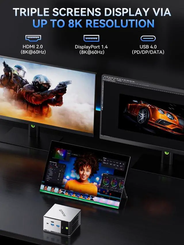 2 2280 slots supporting up to 4TB per slot, 8TB total storage, you have immense room for your entire game library, projects, and media files. ^^ ULTIMATE CONNECTIVITY FOR GAMERS & PROS - Unlock desktop-level graphics with the exclusive Oculink port for a direct, high-speed eGPU connection. Plus, a versatile USB4 port (40Gbps, PD Charging, Video) offers incredible flexibility for the ultimate gaming or workstation setup. ^^ HYPER-SPEED TRANSFERS & DUAL LAN POWER - Transfer large files in seconds with USB 3.2 Gen2 ports (10Gbps) and WiFi 6E.