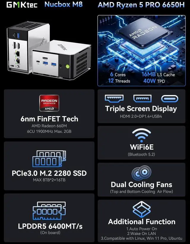 PREMIUM OFFICE GAMING PC MINI COMPUTER - The Nucbox M8 Mini PC is a small form factor Desktop Micro Mini Computer with an AMD Ryzen 5 PRO 6650H (6C/12T 3.30G hz Base speed with Turbo speed up to 4.5G hz) processor. The GPU is integrated with a powerful AMD Radeon 660M 12 Cores Graphics Card; Experience smooth, lag-free performance that handles everything from mid-range gaming sessions to 4K video editing with ease. ^^ BLAZING-FAST MEMORY SPEED & STORAGE EXPANSION - Fly through tasks with ultra-fast 16GB LPDDR5 6400MT/S RAM and a 512GB NVMe SSD. With dual M.