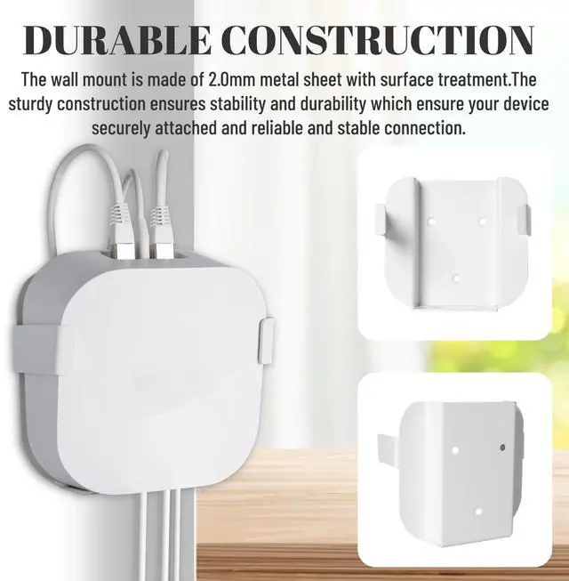 This metal wall mount is designed for eero 7 Mesh Wi-Fi System. it is the perfect complement to your high-performance Wi-Fi network. ^^ The wall mount is made of 2.0 mm metal sheet with surface treatment. The sturdy construction ensures stability and durability which ensure your device securely attached and reliable and stable connection. ^^ Special bending design on the mount back, which improving the airflow of the device, also leave enough spaces for your net cable and power plug wire going through. Cable Management would hide the wires neatly and orgonized.