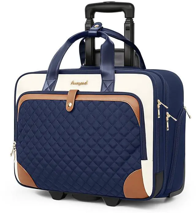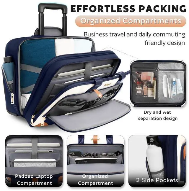 TSA-Friendly & Spacious Compartments: Rolling Computer Bag for women enjoy hassle-free airport with the TSA-friendly design, The size of the overnight bag with wheels is 17.5 * 13.7 * 7.0 inches (L*W*H). opening 180 degrees for quick security checks. The main compartment of this rolling briefcase for women for work features elastic bands with buckles for 2-3 days clothes. Theres also a separate padded laptop pocket, and organizational areas for pens, documents, Can also store paperwork, binder ^^ Elegant Design with
