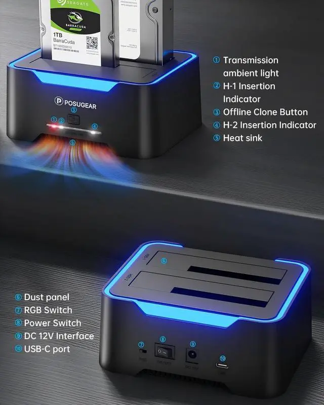 ^^ RGB Lighting: The hard drive docking station is equipped with intelligent RGB lighting, which reminds you of the charging station status during work in the form of breathing lights. You can also turn off RGB lighting by pressing the "RGB switch" on the back of the docking station.