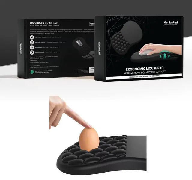 Experience All-Day Comfort and Precision with Our GeniusPad Ergonomic Mouse Pad Say goodbye to wrist pain and discomfort. Our Ergonomic Mouse Pad with Wrist Support is designed to provide lasting comfort and stability whether you're working long hours at the office, gaming into the night, or scrolling through your favorite websites. The memory foam wrist rest conforms to your wrists natural curve, providing effective support and promoting healthy posture. Crafted with a massage design surface, this mouse pad not only looks sleek but also enhances blood circulation and reduces fatigue. The non-slip PU base keeps your mouse pad firmly in place on any surface, eliminating the need for constant readjustment.