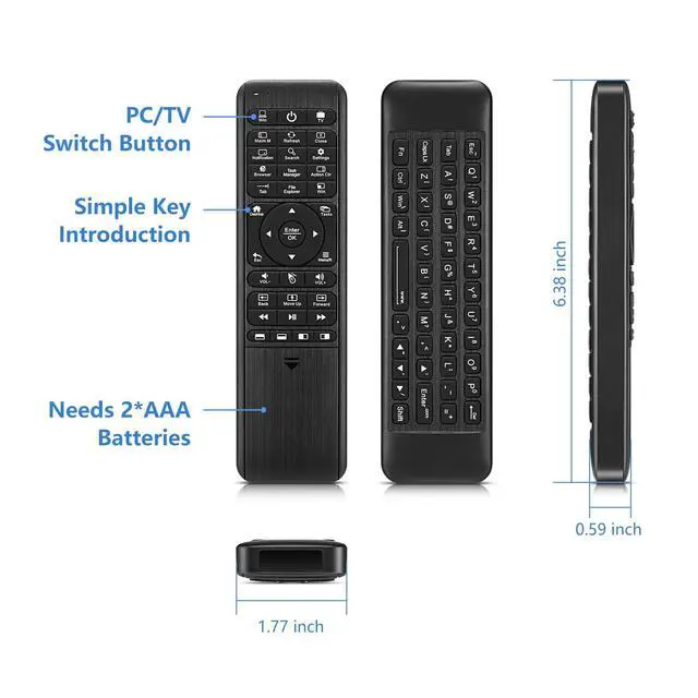 World 1st Remote Control for Win 11As world's 1st GYRO air mouse remote controller designed for Windows 11 OS, W10 air remote mouse's shortcut buttons and hotkeys are fully optimized for Win 11/Win 10. ^^ Backlit LEDs EverywhereThis PC remote has full QWERTY keyboard with double-sided backlit LEDs (contains a power saving timer that automatically turns off the LEDs after 5 seconds without action). Favorable for you using in the dark. ^^ 3-in-1 Control DesignW10 PC remote control can work as a TV remote, mouse and keyboard, making your life more convenient. A switching key easily changes it from TV remote into mouse/keyboard.