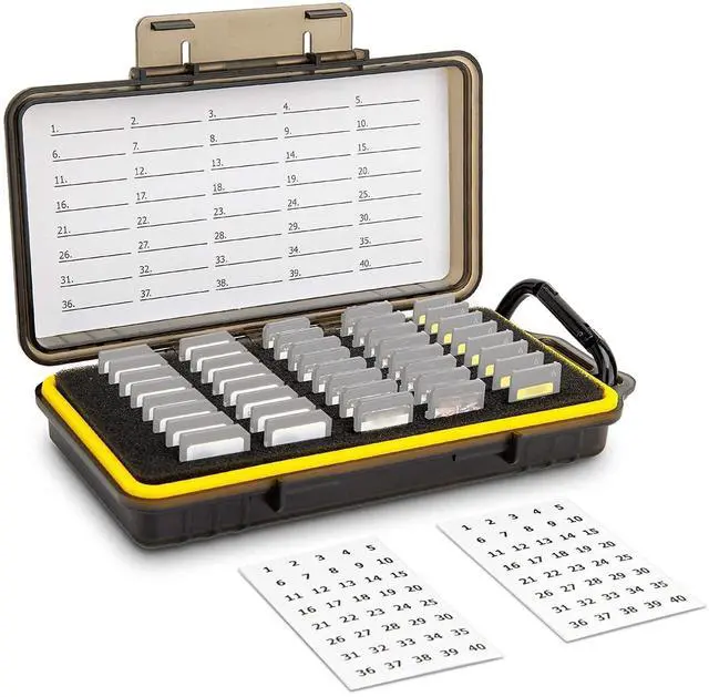 40 Slots Memory Card Case/ This Memory Card Case can store 40 cards, the slot fits SD, MicroSD adapter, CFexpress Type A, and Sony PSVita / Nintendo Switch game cards. / 120 Count Memory Card sticker/ The sticker includes 120 total labels and the size of each label is 0.79 x 0.98" 20 x 25mm), the label keeps your cards perfectly organized and easy to identify. / Package/ Memory Card Case X 1 / Memory Card sticker X 1