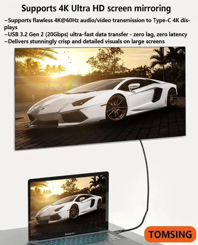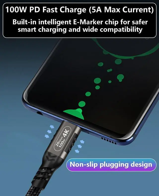 20Gbps high-speed transmission+4K@60Hz High Resolution Video SupportUtilizing USB 3.2 Gen 2 technology, it achieves a theoretical maximum transfer speed of 10Gbps, enabling rapid transfer of large files. With a high-speed transmission capability of 20Gbps, this cable supports 3840x2160@60Hz 4K video signal transmission, delivering fast and lag-free visual performance(Note: Please ensure your connected devices support video input/output via Type-C ports.)