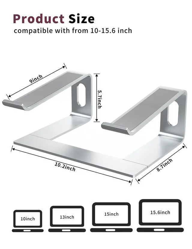 Broad Compatibility - Suitable with laptops of 10 to 15.6 inches, such as MacBook Pro 13/15, MacBook Air 13.3, Dell, XPS, Lenovo, HP, ASUS, Google Pixelbook, Samsung and other notebook computers of 10, 11, 12, 14, 15.4, 15.6 inches, etc. ^^ Ergonomic Design - Elevates your laptop height by 6 inches, a perfect height for your eye, neck and shoulder. ^^ Durable & Protective - Metal appearance made of thickened aluminum alloy, strongly durable. The rubbers on the top and bottom of holder ensure it sticks tightly to your laptop and desk, and protect your computer and desktop from scratches.