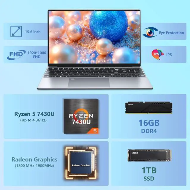 Ryzen 5 7430U processor performanceThis laptop is equipped with an Ryzen 5 7430U processor (Turbo Boost up to 4.3GH z, 6 cores and 12 threads and 16MB of L3 cache). It can run multiple office software and perform complex Excel operations smoothly without any lag. With this processor, you can easily control the light gaming mode, switch between entertainment at will, and get smooth overall system performance. ^^ 15.6 INCH FHS IPS HD DISPLAYThe laptop computer features an innovative narrow-bezel display and a 1920*1080 resolution IPS screen with vibrant colors and clear picture quality, bringing you an immersive visual experience, whether you're watching hd videos or playing games, you'll be able to enjoy a great picture.