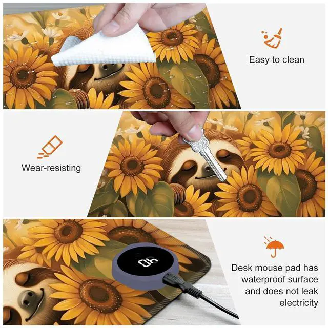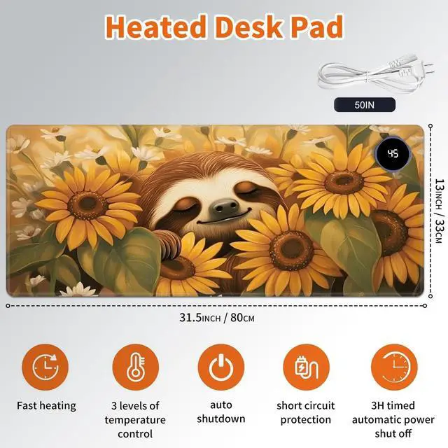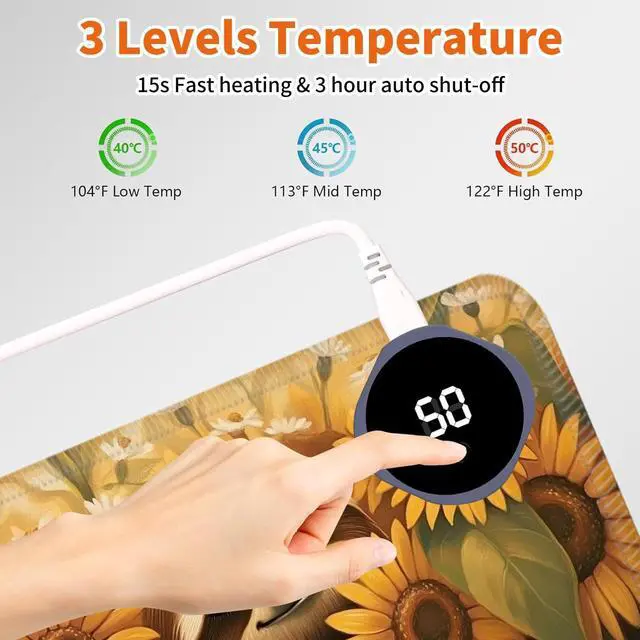 Heated Desk Mat with 3 temperature settings: --1. Low (40C / 104F) for gentle warmth--2. Medium (45C / 113F) for consistent comfort--3. High (50C / 122F) for a quick boost of heatAuto Shut-Off Design--Mousepad warmer includes 3-hour auto shut-off timers. Long-press the power button until it flashes to activate. helping you save energyDurable Material--Crafted from smooth PU leather, Gaming Mouse Pad Warmer features a waterproof and easy-to-clean surface--Heated Desk Mat Non-slip base keeps it securely in place, providing a stable surface for your keyboard, mouse, and laptopLarge & Multi-Functional Design--Large Mouse Pad at 31.5 x 13 x 0.08 inch (80x33x 0.2 CM) is spacious enough for your desk essentials, keeping your workspace neat and organizedPattern Printing Design--Unique Pattern Printing Heated Desk Pads decorate your study, computer desk, bedroom or office, perfect accessory for any modern office and homeNote: When using PU leather desk mat, do not place any items that are easily ignited or damaged by high temperatures, such as laptops, batteries, or other items that are not resistant to high temperatures. If you smell some leather odor during the first use, it will disappear after being left for a period of time. Due to long-term curling and cold weather, the sides of the heating mouse pad are slightly raised. After heating, warm mouse pad will return to a flat state.
