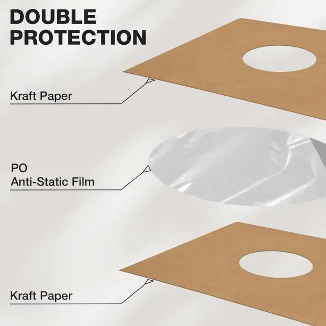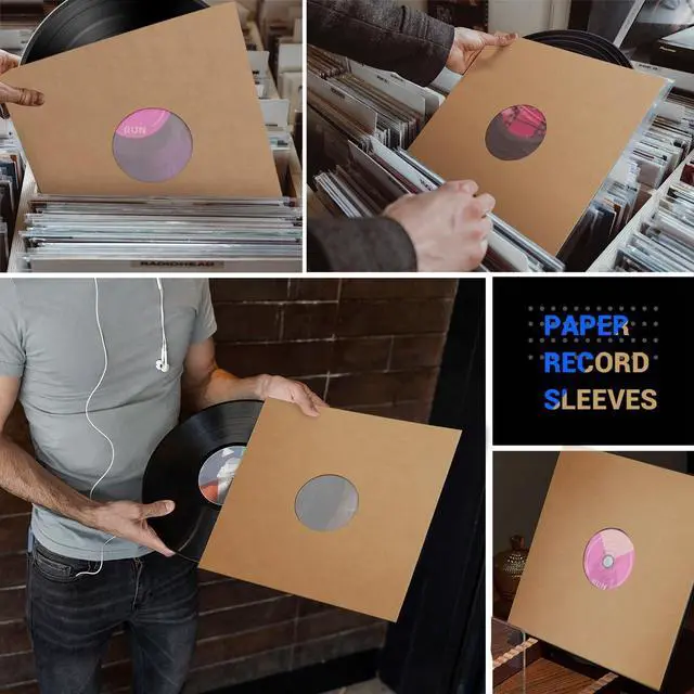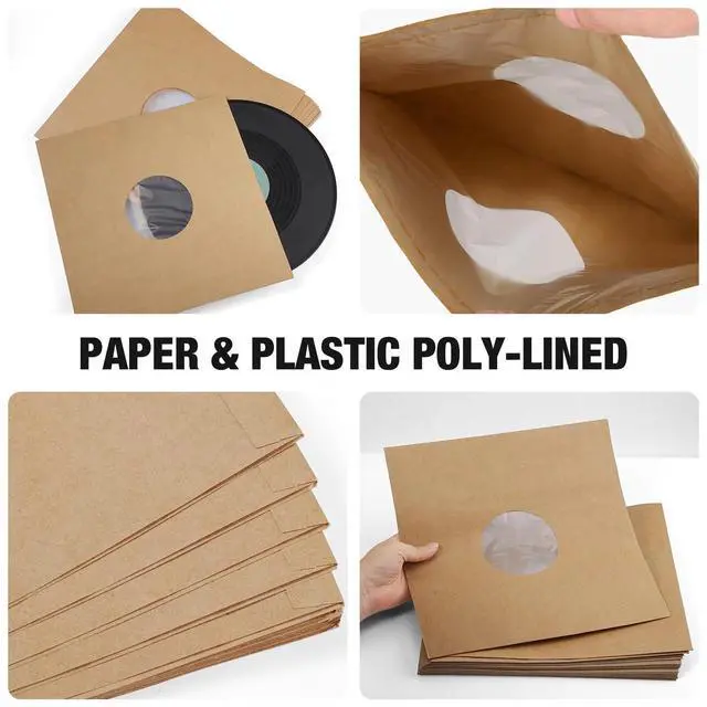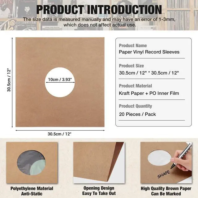 Superior Quality Record Protection-- We use a premium quality kraft paper inner sleeve lined with plastic polyethylene to protect your precious vinyl records. 120 GSM cardboard is thick enough to hold records and will not tear, crack, or fade. ^^ Suitable for 12 Inch Vinyl Record Sleeves-- A pack of 20 pcs brown vinyl sleeves for records with center hole fits 12" records. Vinyl sleeves hold your records securely in place, preventing them from falling out and providing optimal protection. Plenty of sleeves for everyday use, replacement and sharing. ^^ Anti-Static-- Featuring anti-static technology, these jackets help prevent static electricity from attracting dust and dirt for clear sound quality and minimize friction during playback, preserving the pristine sound quality of vinyl records.