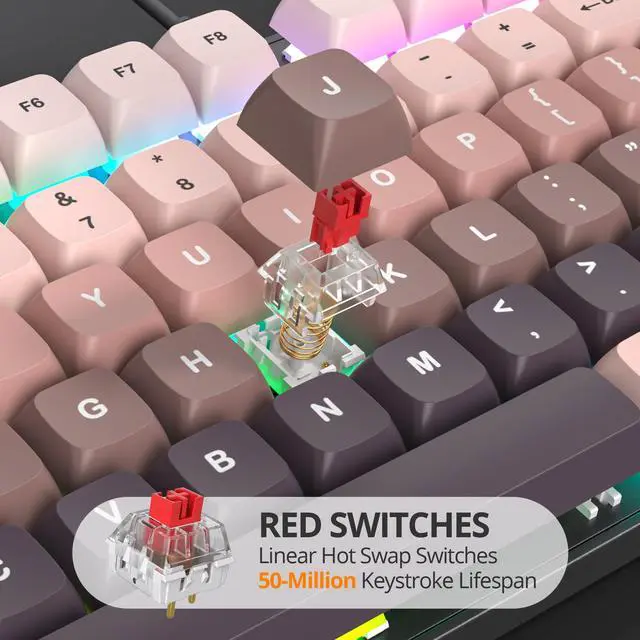 Linear Keystrokes: With a low actuation force of approximately 45g, Red switches require less pressure to register a keypress, reducing finger fatigue during extended use. Red switches are relatively quiet, Perfect for gaming and office work. Best for typing enthusiasts and gamers ^^