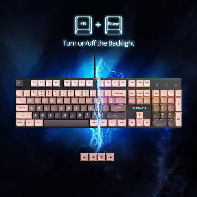 ^^ Illuminate Your Desktop: Light up your gaming experience with the SURMEN V200 full-size mechanical keyboard. With 18 RGB backlight modes, this pink creamy keyboard creates the perfect ambiance. Easily turn off the lighting for a more subdued atmosphere, making it a versatile addition to your setup. ^^
