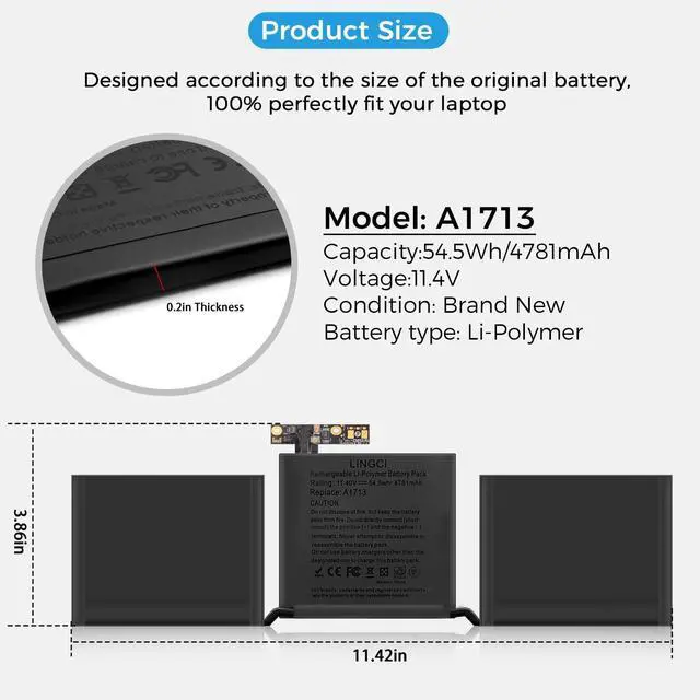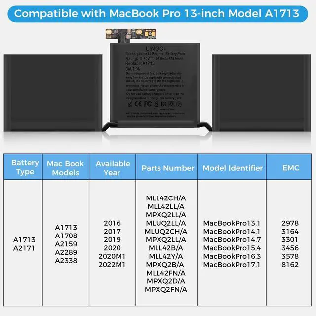 Compatible Laptop ModelsReplace for MacBook Pro 13inch A1708/A2159/A2289/A2338 replacement battery, battery type A1713/A2179.