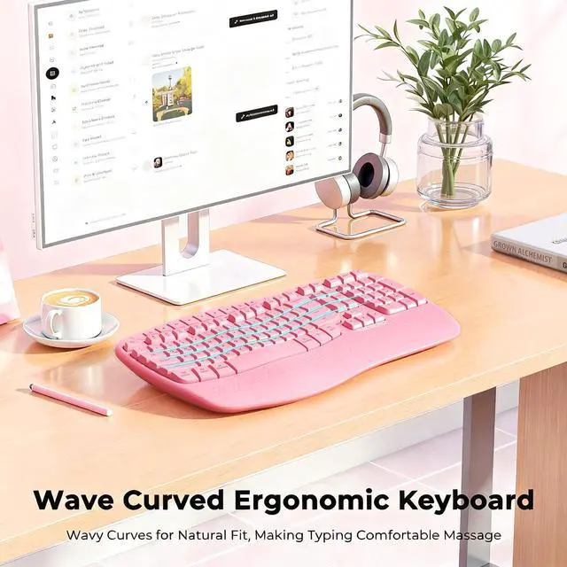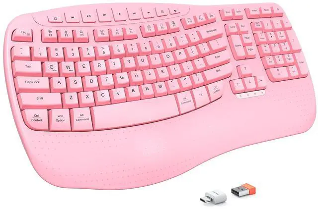 ^^ NEW ERGONOMIC DESIGNOur wave keyboard combines the advantages of ergonomics and retains the familiarity of traditional keyboards. Therefore, you don't need to spend extra time adapting to a new typing method. Say goodbye to the complex learning curve of split keyboards. Even users who are new to ergonomic keyboards can quickly get the hang of it. You can enjoy a comfortable typing experience without compromising your work efficiency. ^^ WIDE PALM REST OFFERS MORE SUPPORTThe wireless keyboard is features a built-in hard plastic wrist rest that provides stable supportdesigned to keep your wrists comfortably aligned.