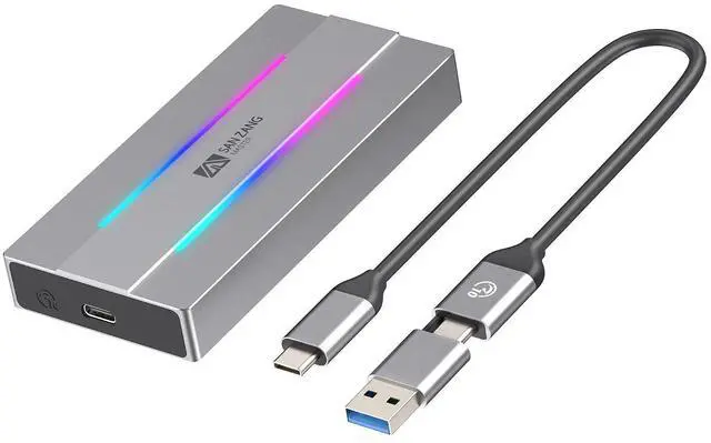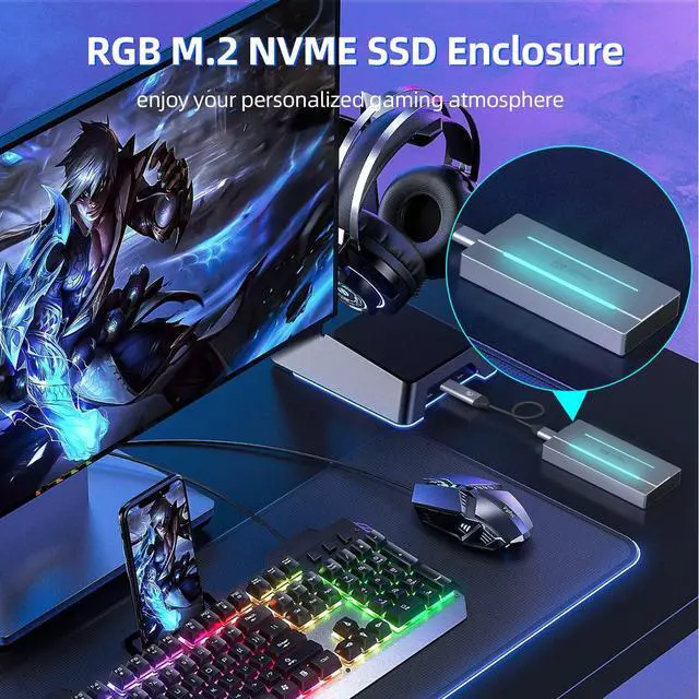 Multi-Color Glowing RGB LightingThis RGB SSD external enclosure has a more colorful atmosphere. The red, yellow, green, blue, and purple are alternately switched slowly during standby; It flashes quickly during reading and writing. The blue light breathes and flashes during sleep. The red light breathes and flashes on when the SSD is not installed. Just enjoy your personalized gaming atmosphere without worrying about the annoying other things. ^^ 10 Gbps Extreme SpeedUsing a high-performance controller IC, makes nvme reader less power consumption and higher stability while data transmission.
