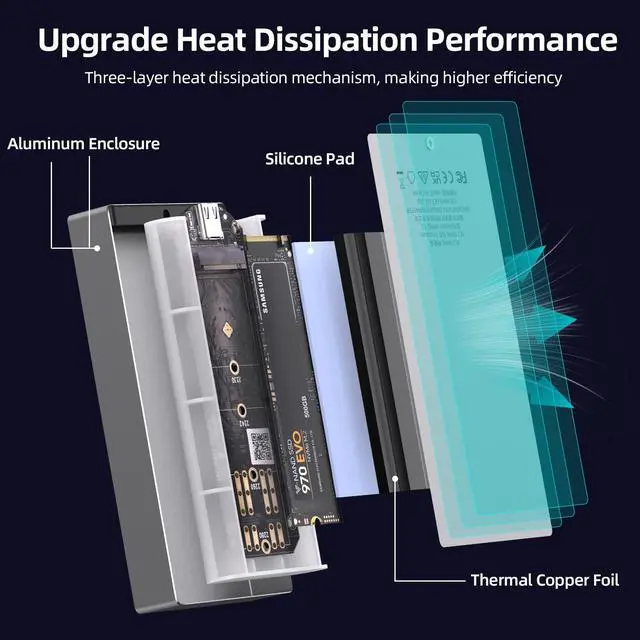 With USB 3.1 Gen2 data bridge, which can provide a data transmission speed up to 10Gbps, and is compatible with both UASP and Trim, can increase the reading speed by 70% and the writing speed by 40% compared with the traditional USB 3.0. ^^ Upgrade Heat Dissipation PerformanceEfficient heat dissipation is important for SSD, not only can ensure stable transfer speeds and no drop down but also extend the life of SSD. The nvme m. 2 enclosure have a three-layer radiating mechanism compared with other products. We add a heat sink that is added between the thermal silicone pad and the aluminum shell so that the heat emitted by SSD can be quickly transmitted to the shell, and the heat dissipation performance is improved more efficiently.