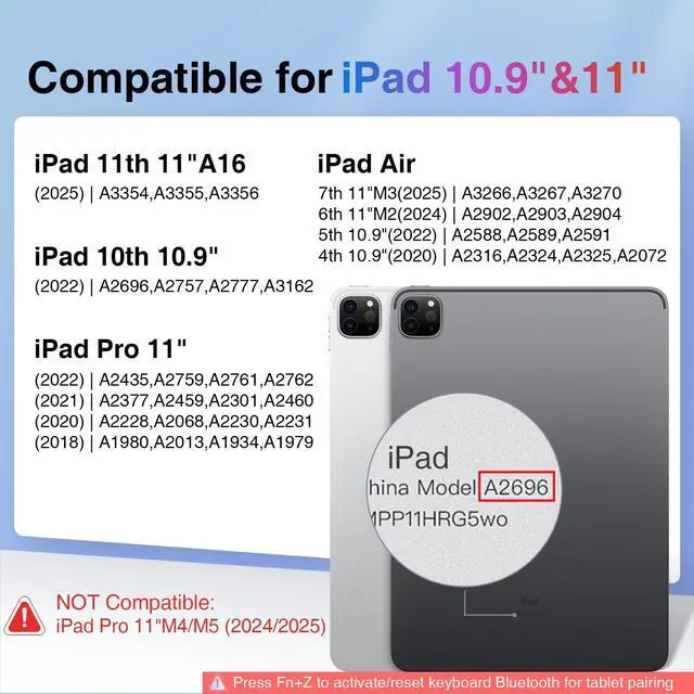 Compatibility: Before making a purchase, please check the iPad model number in [Settings > General > About] and refer to the compatibility chart. Compatible only with iPad 10th/11th (A16, 2025) & iPad Air 10.9" &11" & iPad Pro 11", But not for M4 chip series. ^^ 360 Rotatable and